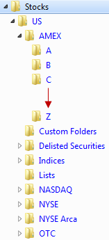 The US historical database is organised by exchange into sub-folders beneath a US folder. The table below shows the folders and the security types they contain.