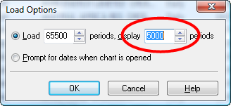By default, MetaStock™ only shows 400 data points (somewhat under two years). To see more data in a chart, you will need to adjust the program's Load Options.