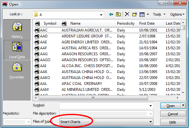 When I go to open a file, I can't see any security symbols or names, even though I have Files of type = Smart Charts selected. How can I fix this?