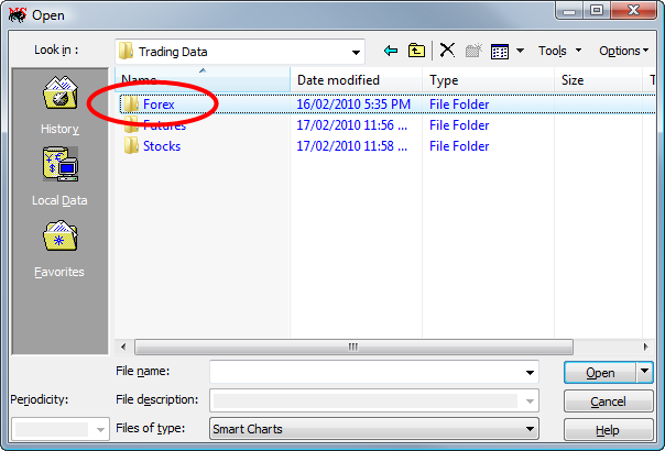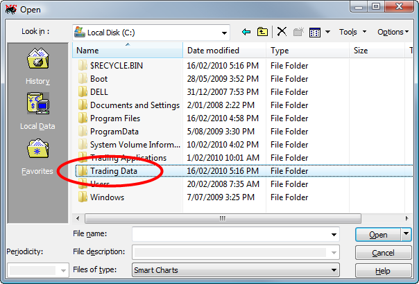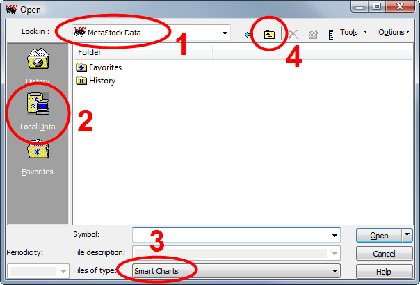 Select "Local Data" on the left [2] and Files of Type = Smart Charts at the bottom [3].