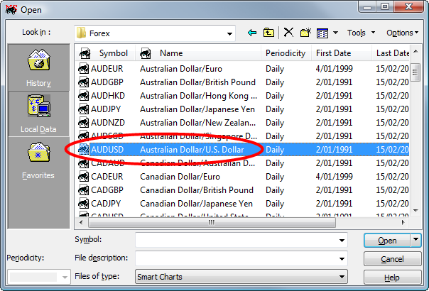 Look down the list for the symbol "AUD/USD" and double-click on it to open that file as a Smart Chart.